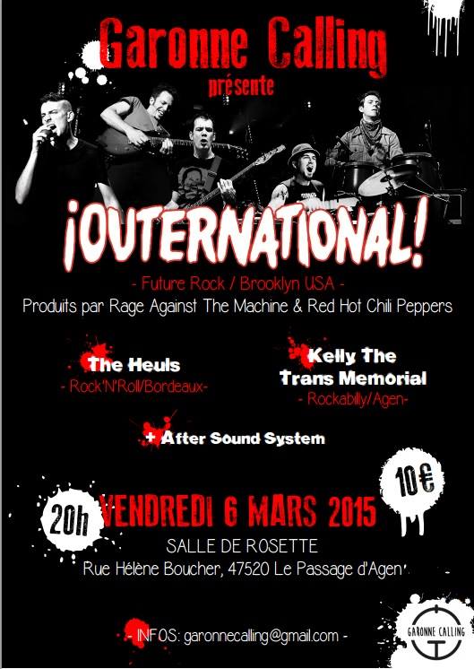 Organisé par Garonne Calling, la salle de Rosette au Passage d'Agen accueillera au Passage d'Agen le future rock des ¡OUTERNATIONAL! de Brooklyn. Les Heuls seront de la partie ainsi que Kelly the Trans Memorial et After Sound System. Un retour encore puisque les Heuls ont participé au Rosette'n'Roll 2012 avec Bolchoï Karma Expérience et Les Anges Oliver.